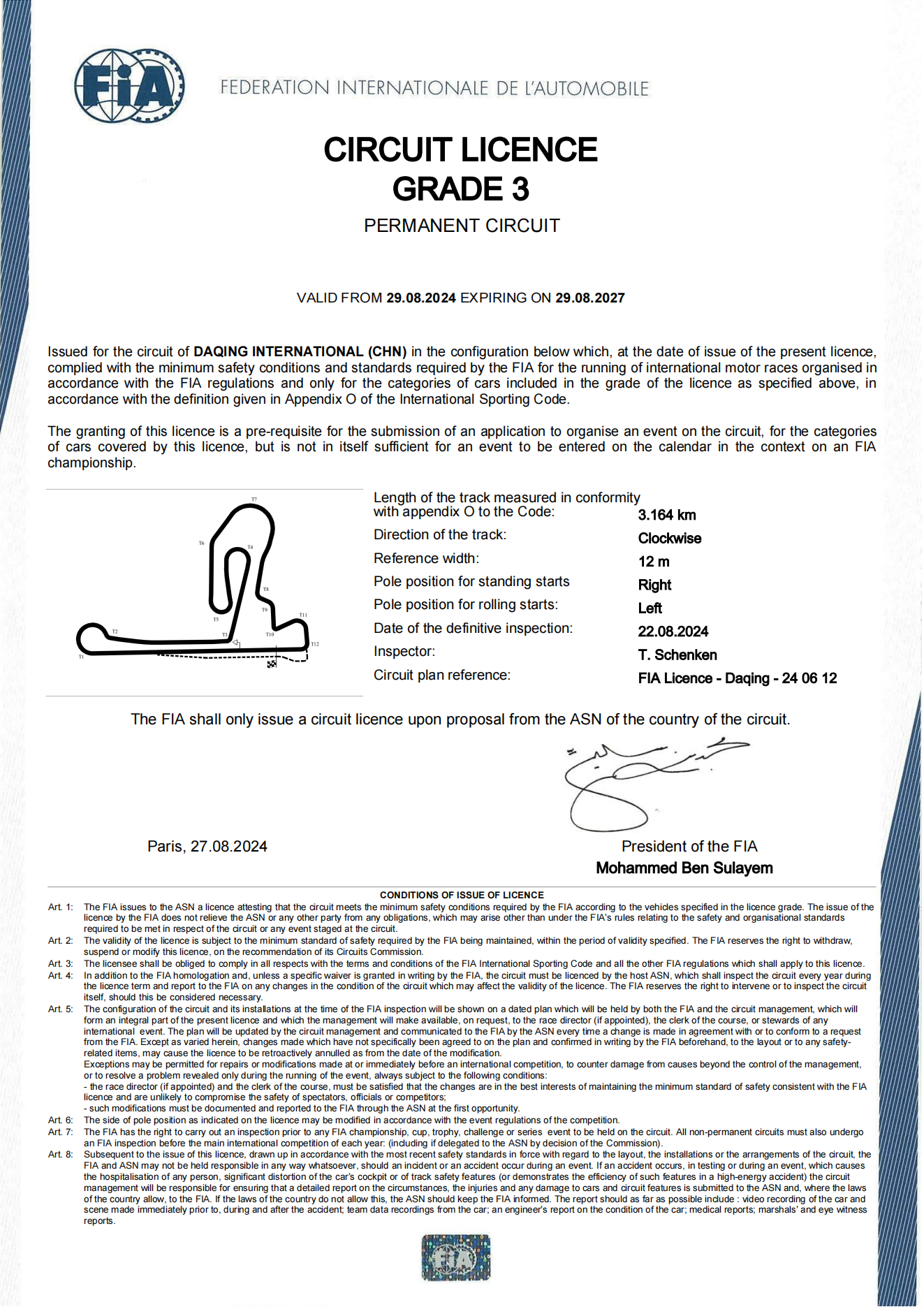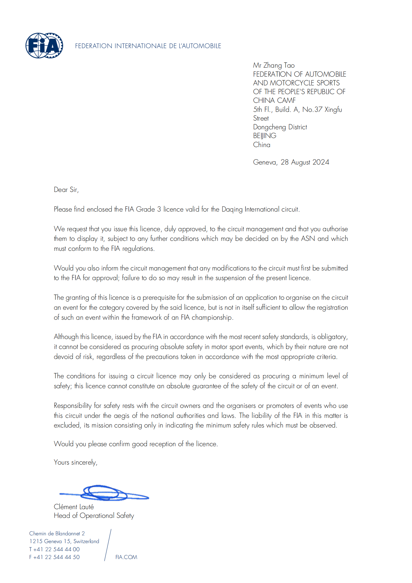 2024年8月30日,由我公司設(shè)計的大慶賽車小鎮(zhèn)FIA三級場地公路賽道順利通過國際汽聯(lián)(FIA)驗收,獲得了國際汽聯(lián)頒發(fā)的三級賽道執(zhí)照。這是繼去年11月份成都天府國際賽道獲得國際汽聯(lián)二級賽道認(rèn)證之外,我公司設(shè)計并通過認(rèn)證的又一條國際級賽道。